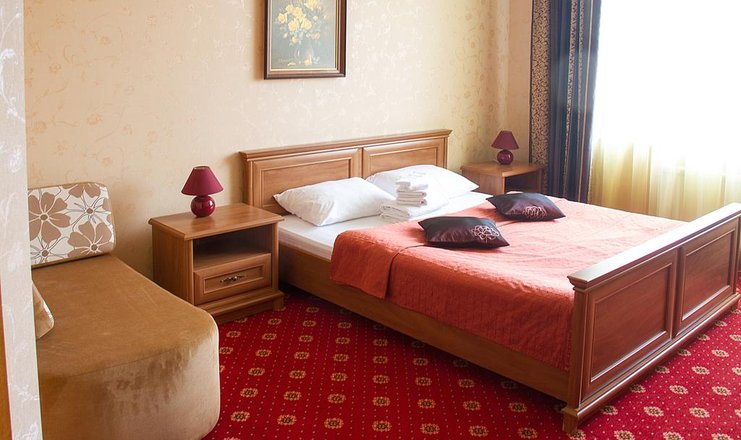 В номере: диван, зеркало, кровать двуспальная, прикроватные тумбочки, стол, стулья, кондиционер, мини-холодильник, сейф, телевизор ЖК, телефон